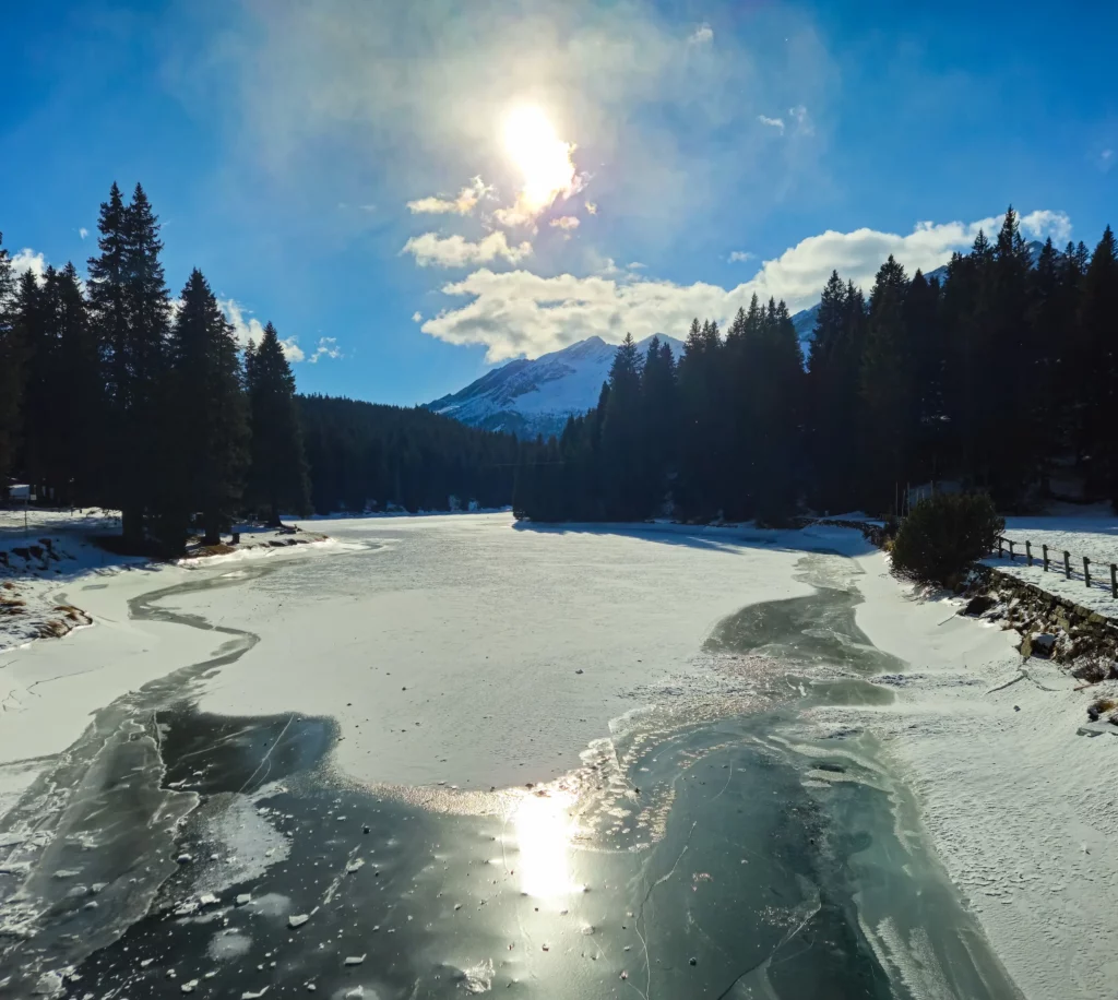 Io e la mia compagna, dopo aver parcheggiato l’auto in un piazzale sterrato nelle vicinanze del centro (zona Ostello e Centro Nordico San Bernardino), ci siamo preparati per partire. Conoscevamo già il percorso, avendolo affrontato in primavera/estate, ma questa volta il paesaggio era completamente diverso: innevato.