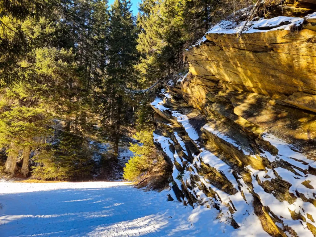Quello che mi ha colpito subito è stato il contrasto: da una parte la roccia illuminata dal sole, con tonalità calde quasi dorate, dall’altra la neve ancora ben presente sul terreno. Intorno, gli alberi creavano un equilibrio perfetto tra luce e ombra, tra inverno e qualcosa che sembrava già anticipare la primavera.